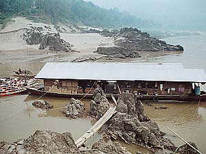 パクベンの船着き場はご覧のように大きな浮き船。この船の上に船着き場も政府のチェックポイントも、そして食堂も売店もトイレも、ついでに交易の市場も含めて何もかもがあるわけですね。でも全てが小規模な故に船の上は常に大混雑。よせばいいのに小サルを放している地元のお客さんまでいて、すっかり楽しめたけれど全然落ち着けませんでした。