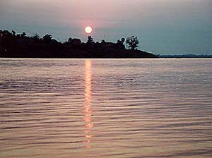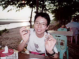 そのあと、この本屋のすぐ隣にある酒屋?(看板も出ていないし入口はどう見ても民家、でもビールやジュースがケースごと積まれているので「ここは!」と直感したのだ)にてとりあえず冷えたビアラオ缶を6本購入。メコンの夕陽を眺めながらっていう趣向はいいでしょ。しかしいざメコンの土手まで来てみたら、すでにポツポツと屋台(でも大した料理はなさそう。ピンカイはない)が出店し始めているじゃないですか。こうなると手持ちの冷えたビアラオ缶がちと邪魔。しかし我々はプラ椅子&机の持ち主に「つまみを頼むからビールは持ち込みでいい?」と、ベストの席をゲットした我々なのでありました。