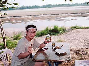 おしんこどん水平線がかしいでるよ、ちゃんと撮ってくれ(笑)。ちなみにこの時は乾期ゆえ本流は奥の方だけ、すぐ下の川らしいのはただの水たまりです。とりあえず持参缶ビールを飲み始めた頃のショット。