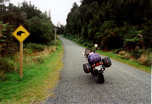 いきなりこんな看板発見。そう、「Kiwi に注意」です。NZに行かれたことのある方でも、こんな看板を見たことのある人はさぞかし少ないのでは?大体 Kiwi といっても、見られるのはいわゆる飼育室の中だけで、あとは Stewart 島とかくらいにしかほとんど残っていないと思っていたのですが、この看板には驚きました。看板の柱が新しいところを見ると、さては最近車で Kiwi はねたな。夜行性の鳥ゆえまさか今出てくることはないだろうけれど、なんだ知っていたら昨日 Okarito 泊まって、夜になったら観察にきたのに(どうせ見られないだろうけどね)。