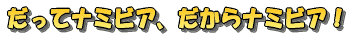 「ナミビア」という国、ご存じですか?どこにあるのかをぱっと答えられる人はよほどの地理事情通のかたでしょう。自分たちも出発の3ヶ月前に初めてその存在を知りました。砂漠あり(そういえばずいぶん前に「生き物地球紀行」あたりで特集していましたっけ)、サバンナあり(つまり動物サファリも可能)、海にはアザラシやフラミンゴのコロニー、砂漠地帯には推定年齢1500歳ともいわれる不思議な植物あり、ついでにアトラクションも数々あり。何とも見どころの多い国なのです。まずは見てやって下さいませ(情報については2001年7-8月現在のものとお考え下さい)。