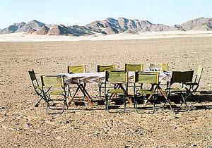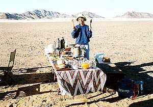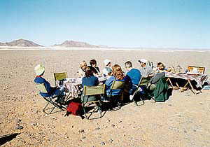 そんなわけでバルーンはサポートカーに収納されつつある。そしてそれと同時に設営されつつあるもの、それは「食卓」なのである。このバルーンツアーには「大平原 −砂漠の朝食−」も含まれているのだ。このパターンはケニアのマサイマラ「草原の食卓」と全く同じだな。そして手慣れた手つきで係の人たちが設営を開始、ものの数分で出来上がった食卓がこちらなのである。