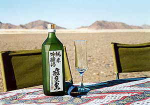 Takemaとしてもシャンパンは別に嫌いではない。嫌いではないが何杯も飲むにはちょいと軽すぎるし炭酸でお腹がふくれてしまう。そこで取り出したるは、はるか日本から持参し、今日もTakema本人とともにバルーンに乗車したライスワイン、そう、日本酒である。その姿をめざとく見つけたクルーのおにいさん、「それはもしかしてJapanese Sakeですか?」もっとも彼はSakeという名称は知っていても飲んだことはないらしい。というわけで試飲してもらった。感想は「甘くておいしいね。でももっとキツイ酒かと思ったよ」とのこと。どうやらウォッカ並みのアルコール度数を想像していたのだろうか。米から作られ、砂糖などの変な混ぜものは一切添加されていないということを詳しく伝えた(つもり)。純米吟醸酒でよかった(笑)。
