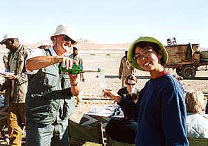 さて、クルーがシャンパンを取り出した。お祝いにシャンパンで乾杯だという。しかし、シャンパンを開ける彼の手には突然刃渡り40cmくらいのナイフ(というかサーベルというか)が握られている。何とコルク栓を抜くのではなく、瓶の口の部分をこのナイフでたたっ切るのだという。アフリカ式だとか何とか言ってたがホントかな(笑)。案外とフツーにご開帳の儀は成功し、ガラスのかけらも瓶の中には入らなかったようだ。そして「Cheers!」しばしの和やかな朝食 by 各国混成部隊が始まった。