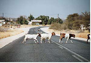 Otjiwarongoから約70km、KalkveldまでのC33号線はきれいな舗装路。車の通行量はB1とは比べものにならないほど少ないのは予想の通り。町の入り口付近では家畜のヤギご一行様もお出迎え。ここからローカルD2414号線に入り、しばらく行くといよいよ看板が出てきた。