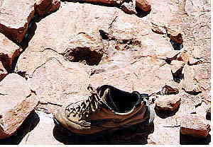 要は、突然の雨で土がぬかるんだ(またはその頃にあった池のほとり)あたりを歩いた足跡だということなのね。2億年前かあ。まだ全然生まれてなかったなあ(←おいおい)。しかし、そんな昔の足跡が地表に露出したままになっているというのはもっと驚きだ。地表の浸食というのがほとんど考えられないほどに雨が少ないのだろうかなあ。