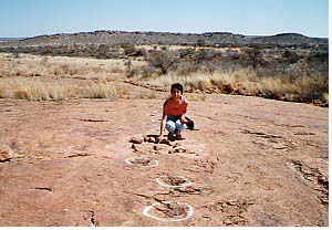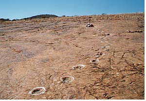 Some 200 million years ago, a variety of reptiles lived in southern Africa, amongst which were Dinosaurs that walked on their hind legs. Here, their tracks are visible in Etjo sandstone, formed from wind-deposited sand which was redistributed by irregular rains. The animals left their tracks on rain-soaked sand or on the shores of ancient lakes. Through the ages this sand, with the tracks, was gradually coverd by layers of sediment, and hardened into stone. Erosion has subsequently exposed the tracks.