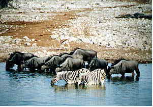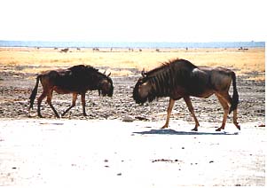 ナミビア到着直後、Daan Viljoen Game Parkで初めてこいつを見たときには「おおっ、いきなりバッファローが出てきたぁ!」とコーフンしちゃったもんですが、これはバッファローにあらず、日本で放映される番組では「ヌー」(正確な発音は「ニュー」らしいですが)と呼ばれ、セレンゲティ(タンザニア)あたりでは雨季と乾季の境目の頃に大移動をするとかいうやつですな。