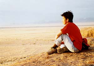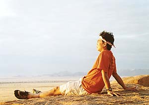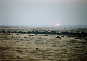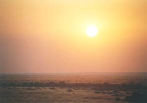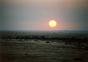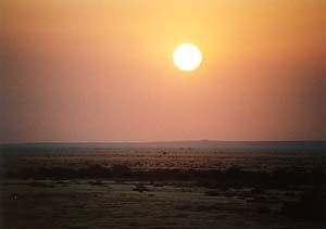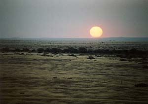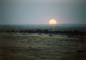 さていよいよ夕陽見物だ。地平線に沈む夕陽というのは北海道あたりにいけば意外と簡単に見られそうなものだけれど、それが実はなかなか難しい。はるか遠くの山がじゃまになったりするし、ましてや地平線近くに雲がかかっていたりしたらぶちこわしだ。しかし、さいわいこのあたりは、ちょっといい場所さえ探せば障害物もない。ついでにここナミビアの乾期には雨が全く降らない。地表が乾いているので水蒸気が上がる絶対量も少ないので雲もできにくい(実はこのあととんでもない場所で曇ったりもしたのだけれどね)。というわけで、夕陽見物には絶好の場所なんだろうと思う。