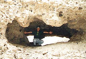 ちなみにこの穴、現在の支流の河床からは約2mの高さにありますが、反対側に行って下をのぞいてみると、あれまというべきか、本流河床からの高さは15mくらい、エラく高い位置にありました。なお、見た感じでは砂岩系の軟らかな土壌のように見えます。確かに砂と石がミックスされているだけのような感じなのですが、触ってみるととても固い!崖の途中から半分顔を出した石に足をかけて全体重を載せてもびくともしません。だからこの洞窟の中にも壁をよじ登って入れたわけで、この思いがけない堅さは何ともフシギ。
