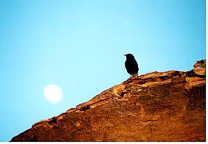朝起きたら、部屋の前の大岩に鳥がとまっていた。まだ月も出ていたのでついパシャ。