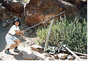 な、何と、手押し式の井戸だ。写真ではよく見えないけれど、湧き出し口からはスコスコやった努力の分だけしっかり水があふれ出てくる。この井戸の脇だけには写真の通り青々とした草が茂っている。さぞかし深いところから汲み上げるんだろうと思い、井戸の深さを聞いてみたら、何とたったの5m。しかし、不思議なのはこの井戸の場所。井戸のあるところから撮った写真が右のもの、ここがまだ山の斜面の途中であるのはご覧の通り。下の平原上での地下5mならまだわかるけれど‥。また向こうの山の斜面を見てもらえればわかるとおり、どう見ても水脈などなさそうな山肌。なぜん、なぜこんな場所に地下水脈が??いまだにわからない不思議です。とりあえず、湧き出す水を手で汲んで、ゴクゴク。うーん、うまいとは言えないけれど、大地の味がしたゾ。