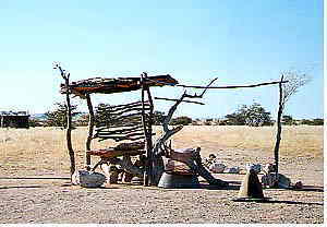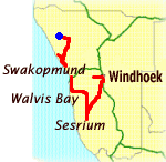 South-east of Twyfelfontein rises a barren 12km-long volcanic ridge, and its foot lies the hill known as Burnt Moutain, an expanse of volcanic clinker which appears to have been literally exposed to fire. Virtually nothing grows in this eerie panorama of desolation, but over the road from the entrance is an incongruous quartz field, which glistens in the sun. (Lonely Planet)