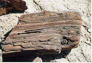左の写真。見事です、幹の節も明らかな、どう見ても「木」そのもの。しかし、これが実は完全な「石」なんです。硬度は「カチンコチン(何とアバウトな)」、重さは普通の石と全く同じ。しかし裏側も含めて見かけの形状は完全な木なんですね。右の写真も、下手をすればキャンプ場の薪といってもおかしくないくらい、木の縦の線が出ているのがおわかりでしょう。