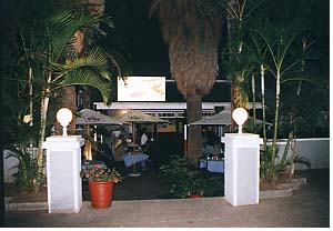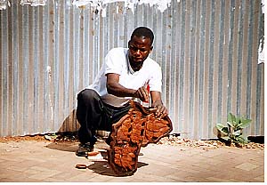 ナミビア最後の滞在は首都Windhoekにてのんびり。とはいってもTシャツなどのおみやげ購入行動はすぐに終わってしまい、「することないなぁ‥」とただ無為に過ごす。これならどこかでもう一泊していたほうが良かったような気もするが、まあしょうがない。オープンデッキのレストランでハンバーガーをほおばりながら「民芸品ただいま作成中、いよいよ仕上げ!」という感じのおにいちゃんの仕事ぶりを観察したり(左写真)、夜は夜でWindhoekに1軒しかないイタリアンレストランでオリックス肉(Smoked)のサラダに「こりゃうまいなぁ」と舌鼓を打ったり(右写真がそのお店)しているうちに夜も更けた。さあ寝るか。