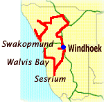 空港の窓越しにナミビア航空唯一のジャンボジェット(ホントに一機しか持っていないらしい)が見えている。ほかに飛行機の姿は見えないし、ま、まさかこんなデカイので行くのか?とは思ったが、滑走路のずぅっと端っこのほうにぐぐっと小さな「いかにも系」の飛行機が見えた。やっぱりな。あ、上の写真にマウスオンして下さいね。ボーイング737が出てきます。