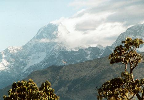 この日の朝もプーンヒルまで足をのばすが、やっぱり天気は今一歩。とはいっても雨が降りそう、というわけではないのだが、山に雲がかかって、ダウラギリ方面は第V峰くらいがやっと見える程度。仕方がないのでアンナプルナ方面を眺めることにする(やや食傷気味)。でも最高でこれくらいしか見えない。ま、今日の目的地タラパニでも見えるはずだし、と思って諦める。