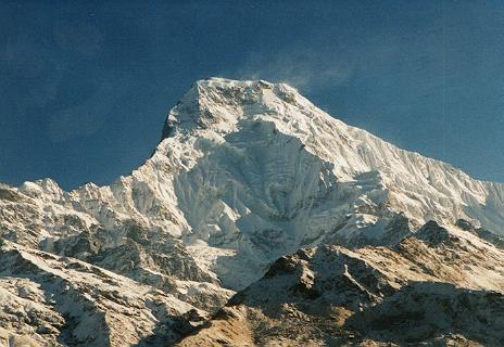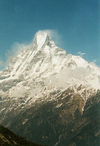さて、出発してしばらくは樹林の中を行き、展望が開けたピークで小休止。ここからデウラリまでは何だか陰湿な林の中を降りる。デウラリからは今回で一番大規模なラリーグラスの林の中を行くことになる。とはいっても山は見えないので、なんだか果樹園の中を歩いているような不思議な気分にさせられる。しばらく山の斜面をトラバース気味に歩き、沢に降りてから一気に登ると、もうそこが目的地タラパニだ。何ともあっけない。あんまり動いていないがとりあえずはお約束ってことでビールを飲む。いつの間にか空はどんよりと曇り、山などは望むべくもない。・・と思っていたら、一気に雨が降り始めた。今回のトレッキング中、初めて昼間の雨だ。雨足はどんどん強くなる。・・と思いきや、屋根をたたく音が変わった。みぞれだ。雹だ。雷まですぐ近くで鳴り出した。「今日は行程短くて良かった!」と、心からほっとする。みんなずぶぬれになって歩いてくる。おーっ可哀想に!(多分に優越感を含む)。ロキシーを一杯もらい、飲んでいても寒いので部屋に入ってシュラフにくるまるが、それでも寒い。どうせ雨だし、こんな時は寝るに限るってことで寝た。しばらくした頃、隣の部屋から声が聞こえた(部屋の壁はとても薄いので、隣人の話し声は細大漏らさず聞こえるのだ)。しかも日本語で。いわく、「ねえ、起きてごらんよ、すごい天気だよ!」何がすごい天気だ、確かにすごい雨だが・・ん?雨の音がしない。さては?がばっと飛び起き、部屋のドアを開けてみると、そこにはアンナプルナサウスとマチャプチャレがそれこそドカーンという感じで顔を出しつつあるところであった。