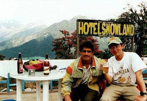 さて、最後の300mくらいは結構へとへとになりながら、ようやっとの思いでゴレパニ(ゴラパニともいうらしいが)へ到着。雲は多いがなかなかの天気。まずは今日明日(ここでは連泊したので)の宿、Hotel Snowland へ。この宿はゴレパニの中でも一番プーンヒル寄り(というか一番高いところ)にあり、高いだけあって景色もいい。なんでもツーリストに一番人気の宿は飯がまずいのでここにした、とはKancha 君の言葉。でも、確かに飯はうまかったし(ダルバートを含めて)、そんなに混んでいないし、広いテラスはあるしでいいところだった(日本人の居候までいたのには笑えたが)。