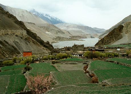 この村の一帯だけ色が違う(周りがねずみ、黄土色なのに対して、ここだけは緑いろで、なおかつチベット仏教寺院のオレンジが際だっている)ので、遠くからでもよくわかる場所である。これより川沿いへの上流へはトレッキングパーミットでは入域することの出来ない未解放地域である。いわゆるローマンタンまではカグベニからさらに3日この川を遡ることになるらしいが、入域料はひとりus$600だか700だとか。おそろしい・・でもこの町はなかなかのんびりとしていいところだ。ここに限らず、カリガンダキ沿いにはいまだに車道がのびておらず(たぶんその予定もないだろう)、おかげでせせこましい雰囲気を持った村などどこにもない(あえていうならジョムソンだけど)特にこの村の中心部(寺院周辺)は迷路のように入り組んだ狭い通路が印象的だ。ムクティナートに行く際には必ず立ち寄って、出来れば1泊するのがおすすめ。ただ、自分の行ったときはまだだったが、ここ数年のうちにこの村にも電気が通じるらしい。日本のODAによるものらしく、途中においてあった電信柱にはその旨が記載されてあった。電気が来たらこの村も変わるんだろうなあ。