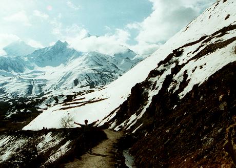 いよいよ最後の町ラニポワへの登りにかかる。この頃になると空は今朝と同様どんよりとしてしまい、またもや暗うつな雰囲気に。ここで自分と同じようにガイドを連れたソロの日本人トレッカーK君に追いつく。彼は最初反対側からトロンパスを越えてこっち側に来るつもりだったが、ガイドの装備の都合で一旦引き返し、今度はこっち側からムクティナートを往復すると言うことだ。「このガイド(フル君よりも少し年上)、スニーカーでトロンパス越えようって言うんだから、参ったよ。雪もたっぷりあるっていうのに・・」ご愁傷様とはこのことで、彼はおかげで念願のトロンパスを越えられずに帰ることになったらしい。カトマンズ着いたら旅行会社にくってかかる心づもりらしい。どこまで会社に言い寄れるものなのだろうか。