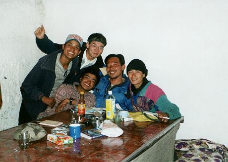 この写真はラニポアの宿で、掘りごたつの親戚みたいなやつで暖まりながらわいわいやってた夜の一枚。一番左がフル君、その隣で手上げてんのが自分、青いダウン着てるのがK君である。さすがもう2週間トレッキングしてるK君、肌の色はもうすっかりネパリと同じだ。