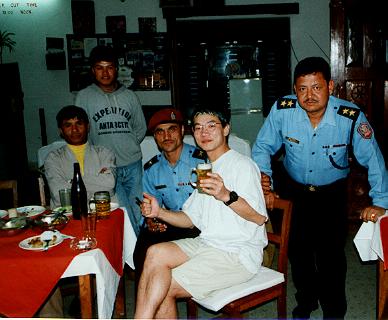 で、日がそろそろ暮れようとする頃になり、話してたうちの二人が帰るということになった。それまでジャンバーを着ていたのでわからなかったのだが、なぜか彼らがそれを脱ぎだしてみてびっくり。その下からはポリスの制服が。「えっえっ、あなた達警官だったんですか!?」「そう、これから仕事なものでね。」驚いたけれど納得できた。なぜならその二人だけは、話に熱心に参加してはいたが、酒は一切飲まずにジュースで通していたのだ。こっちが勧めても「いや、結構」だったので、二人とも酒飲まない人なんだなあとばかり思ってたんだけれど、これから仕事(というよりは勤務中だったらしいが)だから飲まなかったんだ。えらいぞネパールポリス!