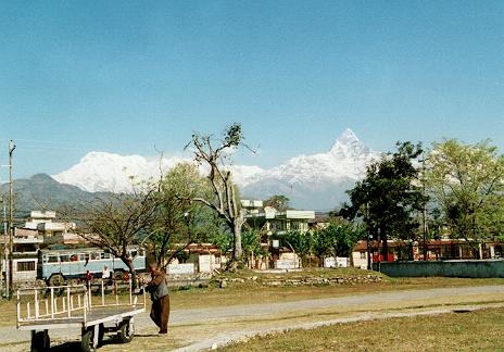 空港からだってマチャプチャレはこんなに綺麗に見えます。さて、到着してこの景色を見ているうちに、一人の客引きあり。でも、「The 客引き」と言った感じの人物ではない。実は、ポカラの空港でリコンファームしようとしたことのある人ならわかると思いますが、あそこにはコンピューターがない!(ちなみに、カトマンズの Domestic Airport でも、チェックインカウンターを見る限りそのようなものはなかったぞ。もちろん International にはあった)少なくともロイヤルネパールのポカラ空港内オフィス(6畳くらいの部屋)にはなかった。それでも、昨日宴会関係のしがらみのためにRFできなかった自分は「何とか!」と言うわけです。でも問題が一つ。係員は聞いてはくれるんだけれど、問い合わせ一つしようとしてくれない。そしたら彼は、いろいろ「ここで国際線のリコンファームしようとしても時間の無駄だよ。市内にネパール航空のオフィスがあるからそっちならコンピューターがあるから早いし確実だよ。」といってくれ、連れていってくれました(さほど距離じゃなかったけれど)。