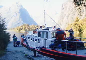 で、何日かを一緒に過ごしたトランパーの方々とはここでお別れ。皆さんはこの船に乗って終点ミルフォードサウンドまで帰ることとなる。雨の日などはそりゃこの船の方が絶対いいに決まっているのだが、我々は行きの船の中でシーカヤックの予約をしているのだ。今日も快晴であるだけに大正解!
