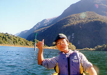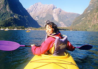 荷物は全部別の船に預け、二人用のカヤックに乗り込む。ここからミルフォードサウンドまでは大した距離があるわけではないが、最後を華々しく飾る、絶妙のアクティビティといえよう。ちなみに、二人ともシロートです。入り江の一番奥だけに波があるわけでもなく、漕ぐパターンさえつかんでしまえば簡単ですから尻込みしないでどうぞ。