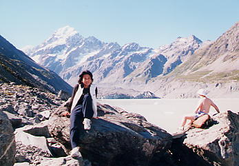 シェルター脇の小川で生ハムサンドウィッチ+ビールの遅い昼食を済ませ(おしんこどんはここで昼寝)、トコトコと歩いていくうちに、ようやく着きましたフッカー谷の氷河湖。ま、ここまでなら誰だって普通のスニーカーで歩いてこられます(ただし天気のいい日)。そんなわけでとりあえず記念写真(下)。すぐ横にいたおじさんがすっかりリラックスモードになっているところからも、この日の天気の良さがわかります。