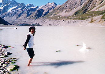 ここはさすが氷河湖。湖のあちらこちらに氷が浮いています。ここで突然意を決したしんこくん、やおら靴を脱ぎ始め、氷をGETせんと果敢に向かいますが、あのねえ、いくら気温が高くても、相手は氷を溶かさぬほどの水温の湖だよ。…予想通り「ひぇー」という顔をしながら撤退せざるを得なかった彼女ではありますが、その「やる気」は、見事後日ミルフォードのサザーランド滝にて実を結んだのでありました。