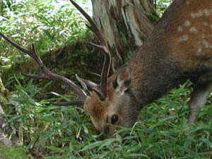 さて、しばらく山を下ってきたら(ちなみに駐車場から頂上までの標高差は200mもありません。登山道も整備されているので、雨の準備を除いて特別な装備は何もいりません。ここだけの話ですがおしんこどんは裸足にビーサンで歩いてました(爆)。で、突然野生の雄シカ発見。野生ゆえ、公園のように角切りもされませんから立派な角です。シカに限らず野生動物は無理に近づくと防御のために攻撃してくるものですが、こいつは全然たじろぎもしなかったなあ。上の写真はデジカメでしたので極端な望遠で撮ったわけじゃなかったんですが(実際距離=2.5mくらい)。登山道(いや、雰囲気的には「登山遊歩道」)の真横にいるんだからしょうがないよね。でも看板にも書いてありましたが、紀伊半島に限らず保護地域周辺のシカは、北は北海道から南は九州沖縄まで、食害が深刻なんですよね。遊歩道沿いこそ木の幹に金網巻いてましたがあれじゃきびしいなぁ。上の写真のように下草食べているだけならいいんだけれど、冬はそうも行かないでしょうしね。