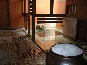 手前にあるのは荒塩が詰められた瓶。身体をこすると気持ちいいんだなこれが。