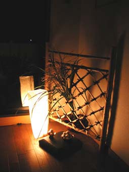 そして10/2。見事に雲一つない夜。おしんこどんが以前作った枝折戸(しおりど)が久々に日の目ならぬ月の目を見る日がやってきた。ついでに間接照明の灯りをともす。ちゃんとススキも手に入れてきた(偶然だけど)。団子もスタンバイOK。というわけで、天井の灯りを消し、雰囲気作りは整った。窓硝子に映る照明がまた小憎らしいほど独特の雰囲気を醸し出している。うーん、上出来上出来。