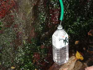 そこで、週末はバイクなどでどっかへ出かけるTakemaのこと、最近は空のペットボトルをトップケースに3-4本詰めていくようにしている。飲めそうな水源があったらそこの水を詰めてくるのだ。上の写真もそのような水源でのひとこま。ホースから出ているのは山の湧き水だ。最近はこういう「水汲み」もそれなりにブームで、中には10リットルの巨大ポリタンクをいくつも持ち込む人もいる。まぁうちらのようにペットボトル数本だけ持参というのはまだまだ可愛いレベルなのだろう。