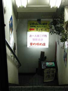 道路沿いのビル地下に続く階段の億から、何やら呪文のようなマイクの声がうっすらと聞こえてきた。見ると、「昔の唄の店」との看板がある。曲数二万曲、二千円、食べ物飲み物持ち込み可との書き込みも発見した。しかし、「昔」という概念はあまりに大雑把すぎて、一体どの時代を指しての「昔」なのだかよくわからない。まぁ間違ってもグループサウンズなどお呼びでないことは確かで、東海林さんとか「月月火水‥」あたりを知らないと完全に浮いてしまうだろうことは容易に推察できるところである。まだこの階段を自信を持って下りることはできそうにないなぁと、おそるおそる魔界の入口を眺めるにとどめた。