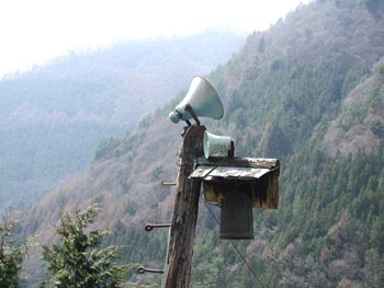 だいぶくたびれた木製電柱の先には、昔懐かしい「半鐘」。小さいながらもしっかり屋根付きだ。火事などの非常事態にこれで住民に事の急を知らせるため、昔は結構どこででも見られたものだ。でも… そのまた先にはしっかりと「スピーカー」。今ではこれで村内への伝達を行っているのだろう。すぐ下に、一回り小振りのものが同居しているのが何だか可愛いといえば可愛い。半鐘は停電などのさらなる非常時用に残してあるのだろうが、小屋根の傷み具合からするともう相当期間放っておかれているようだ。というより、老朽化していて、叩いたら鐘ごと落ちてしまいそう(^.^)。
