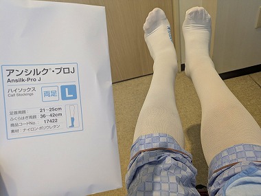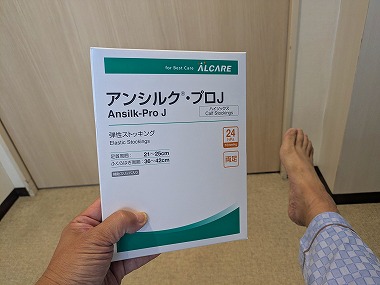弾性ストッキング。もちろん初めて履きますが、医療用のストッキングで足先のむくみや血液の対流を抑止する(いわゆるエコノミークラス症候群を抑止する)ためのものなのだそうです。手術は全身麻酔なのでたぶん身体機能の多くがわやくちゃモードに入るがゆえにこういう防止策も必要なのでしょう。もっとキツイ感じかと思っていましたが案外しっくり。 |