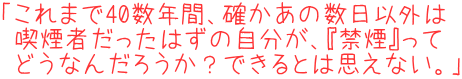 長々と書くのも面倒なのであっさり書いてしまうと、「ほぼ普通に禁煙できました」。この日の外来受診日だけは「勝手にノーカウント」としたので翌日からでしたが。 |