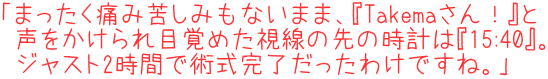 全身麻酔の場合目が覚めても意識がもうろうとする場合もあるようですが、自分の場合はすっきりしゃっきりでした。「ジャスト2時間か」と瞬時に認識し、今も覚えているわけですから間違いないです。 |