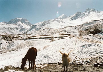 ネパールのアンナプルナ周辺、ジャルコットの村付近を歩いていたときに撮った何気ない一枚。「馬とにわとり、背景は雪山と青空、まぁこんな感じかな」とカメラを向けたら、その瞬間、偶然ニワトリが羽ばたいた。しかし、帰国後に現像から戻ってきた写真を見て思わず笑ってしまった。