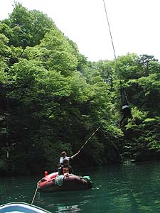 それは、ジャンプ後ボートに収容されたあとにジャンプお立ち台直下から撮ることのできる撮影機材があるのは今しかない、ということです。そりゃそうだ、普段飛び降りる時は一切の荷物&小物(ポケットの中も含めて)を持たないでジャンプしちゃいますから、下から写真を撮れるのはそうそうない機会なんですね。もっともデジカメの残りメモリが余りなかったんでろくなもんは撮れませんでしたが。