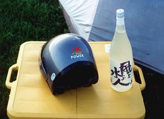 ヘルメットには「酒POWER」のロゴ。果てしなく続く(?)芝を背にして一升瓶を手に気合いを入れる。