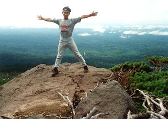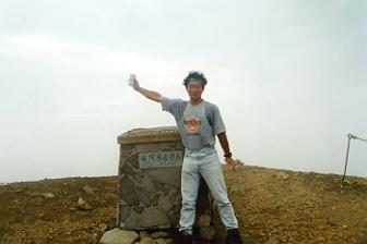 頂上(1499m)はガスと噴煙。展望はあまりなし。時折阿寒富士と雄阿寒岳が見える程度。髪の毛の逆立ち方が笑えるのだが、スキャンが荒いためよくわからない。着ているTシャツは Hardrock Cafe(Kuala Lumpur ただしバッタ物)。手に持つビールはサッポロクラシック。