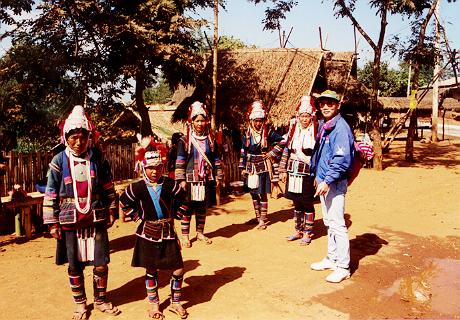 さて、ショックも癒えぬまま、バイクを変えてもらい(AX-1のほうがギアチェンジがしやすかったのだ)再びツーリングを続ける。さらに下っていくと、道沿いにアカ族の村があった。民族衣装に身をつつんだ女性達が何人か座っていた。バイクを止める。こうなると普通は土産物を売りに来られたり、写真を撮らせて写真代を請求されたりする(メーサイの橋のたもとなんかすごいものね)ことが多いんだが、ここではちょっと違い、写真は撮らせてくれるのだが直接お金は請求してこない。ただ、すぐ近くに Donation Box らしき箱があり(箱に書かれているのはタイ語のみなので読めない)、どうやら寄付はその箱に入れてくれ、ということらしい。なかなか賢いやり方だ、と感心しつつ、彼女らにちゃんと見えるようにお金を投入する。