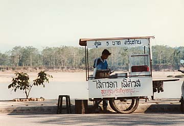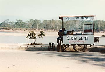 メコン川沿いで屋台を出すおにいちゃん。おいしそうに湯気を立てる寸胴、「いつ注文されてもOKだぜ!」(左の写真)