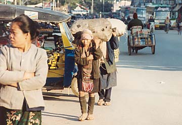 メーサイには少数民族の人々も買い出しにやってきます。左はアカ族の女性。足下のゲートル(古いな(^.^))が特徴。