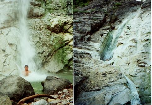 ここの滝はかなり大きく、3段に別れています。裸で登るのは恥ずかしくもあるのですが、1段目と2段目の滝壺に入りに行くのも面白いです。もちろん傾斜はきついのでこけたら確実にけがします(傷口に温泉がしみて因幡の白ウサギ状態になりそうだし)。でも、自信のある人は是非トライしに行って下さい。一風変わった天然湯船で気持ちいいです。