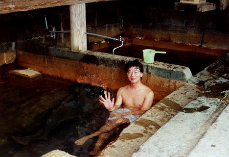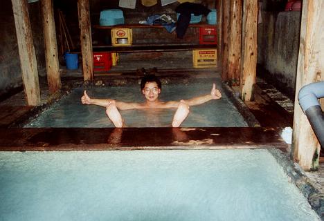 男女別の完璧な温泉浴場。とはいっても集落の全人口が12人で、宿は自分たちの泊まった民宿1軒だけだから混んでいるはずはないけれど立派な建物です。確か宝くじだかなんだかの資金援助のもとに作られたとかいうことでした。湯もタイル張りで、透明な湯なのですが白い湯の華がたくさん浮いてきます。こういう温泉もめずらしいなあと思いながらゆっくりと身体を洗い、広い湯船に身体を沈めると、何だか自分がどこにいるんだかわからなくなってきます。ここがまさか口永良部の小さな集落なんて・・